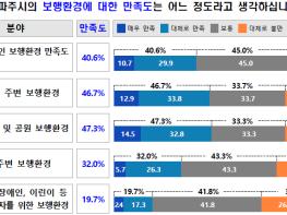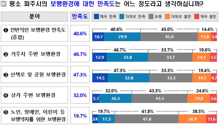 파주시의 전반적인 보행환경에 대한 시민들의 만족도는 40.6%로 나타났다. 분야별로 보면 ‘산책로 및 공원 보행환경’이 47.3%, ‘거주지 주변 보행환경’이 46.7%로 만족도가 높은 반면, ‘상가 주변 보행환경’과 ‘노인, 장애인, 어린이 등 보행약자를 위한 보행환경’은 각각 32.0%, 19.7%로 다소 낮은 만족도를 보였다. 이런 실정 속에서 파주시가 ‘누구도 배제되거나 소외되지 않는 보행친화도시’를 천명한 만큼, 보행약자도 편리하고 안전하게 걸을 수 있는 무장애 보행환경으로 점차 개선해 나갈 것으로 기대된다.