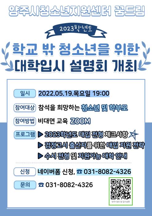 대학입시설명 참석을 희망하는 학교 밖 청소년과 학부모는 네이버폼이나 양주 꿈드림(☎031-8082-4326)을 통해 신청하면 된다.