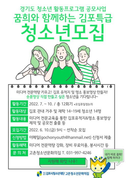 (재)김포시청소년재단 고촌청소년문화의집에서 2022년 경기도 청소년 활동프로그램 공모사업 ‘꿈희와 함께하는 김포특급’ 프로그램의 참가자를 모집한다.
