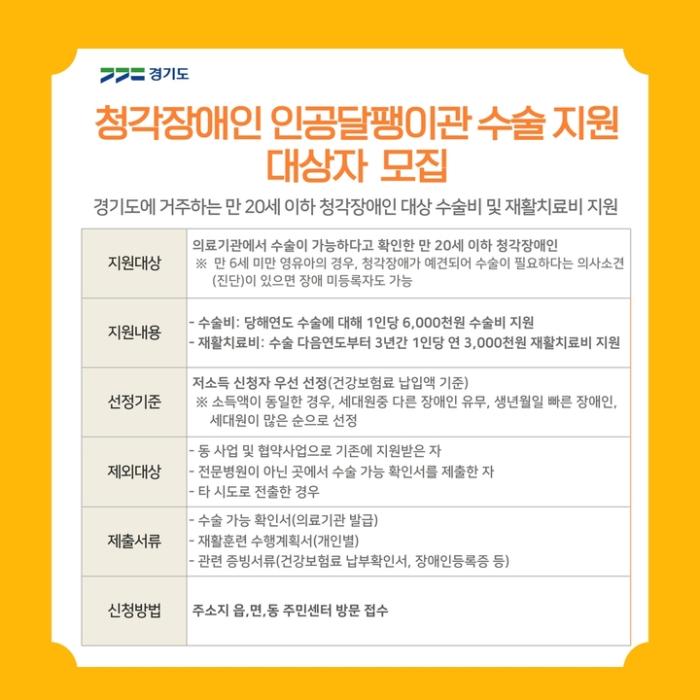경기도, '청각장애인 인공달팽이관 수술·재활지원' 대상자 추가 모집