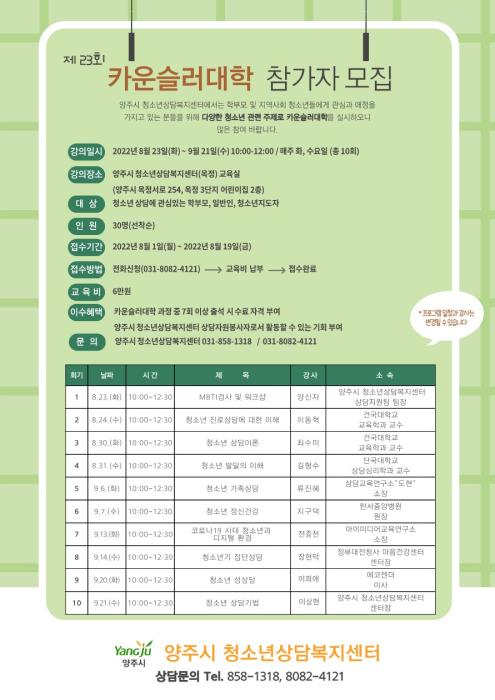 양주시 청소년상담복지센터는 오는 19일까지 제23회 카운슬러대학 참가자 30명을 선착순으로 모집한다.