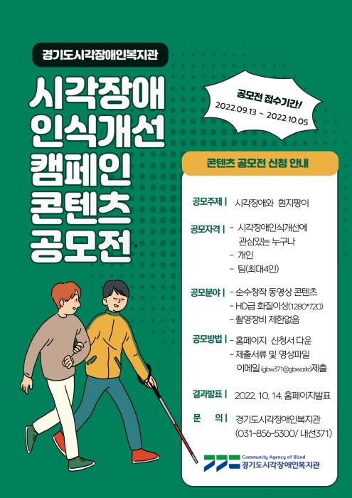 경기도시각장애인복지관(관장 정옥동)은 “흰지팡이의 날”을 맞아 10월 5일까지 <제1회 경기도시각장애인복지관 인식개선캠페인 콘텐츠 공모전>을 진행한다.