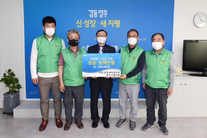 양주시(시장 이성호)는 지난 2일 직장·공장 새마을운동 양주시협의회(회장 오수영)에서 양주시청을 방문해 관내 소외되고 어려운 이웃들을 위해 써달라며 성금 1백만원을 기부했다고 밝혔다.