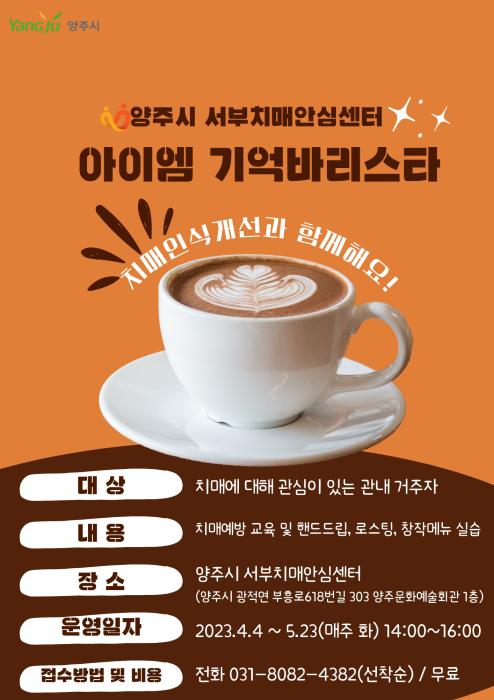 양주시 치매안심센터는 치매 예방과 인식개선을 위한 프로그램‘아이엠 기억바리스타’에 참여할 시민을 모집한다.