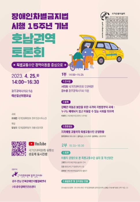 국가인권위원회 광주인권사무소는 '장애인차별금지법' 시행 15주년을 맞아 호남권(광주·전남·전북) 정책 토론회를 연다고 24일 밝혔다.