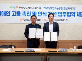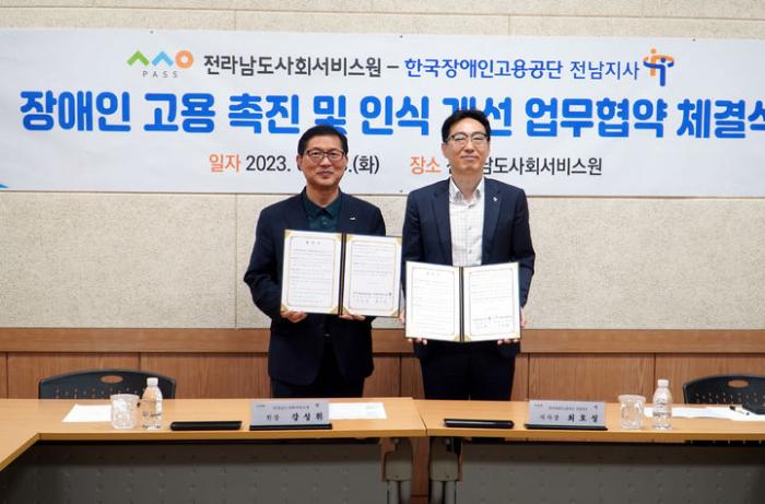 한국장애인고용공단 전남지사는 전라남도사회서비스원과 13일 장애인 고용과 복지증진을 위해 상호협력하는 내용의 '장애인고용을 위한 업무협약'을 체결했다.