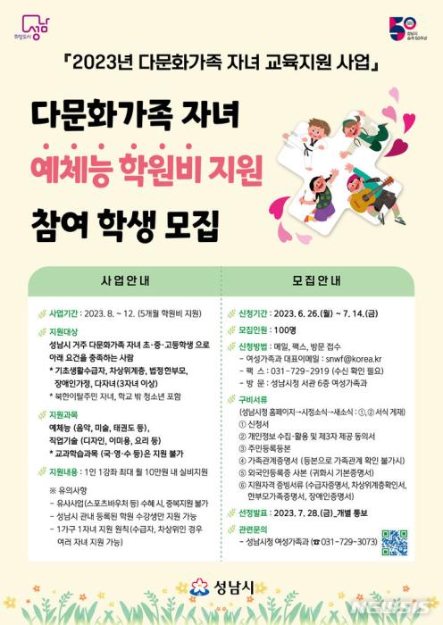 경기 성남시가 다문화가족 자녀를 대상으로 오는 8월부터 연말까지 5개월간 월 최대 10만원의 예체능 학원비를 지원한다고 26일 밝혔다.