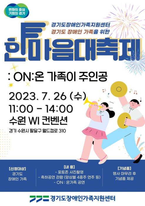 경기도장애인가족지원센터는 오는 26일 오전 11시 수원 WI컨벤션센터에서 '제1회 경기도가족한마음대축제'를 연다고 13일 밝혔다.'ON:온가족이 주인공'이라는 부제로 열리는 이번 행사는 가족이 함께 공연에 참여해 긍정적 상호작용의 기회를 가질 수 있는 자리다. 가족의 의사소통 기술 강화에 기여해 일상 속에서 가족이 갖는 스트레스와 심리적 부담감을 해소하기 위해 마련됐다.1부 기념행사에서는 장애인 가족의 복지증진을 위해 노력한 개인 및 단체 유공자에게 표창이 수여된다.2부는 장애인가족의 재능을 발휘할 수 있는 '온가족한마음' 공연 축제다. 예선을 통과한 도내 장애인가족 5팀이 경연의 의미를 뛰어넘어 공연에 집중하면서 소중한 가족과 화합하는 시간이 될 것으로 보인다. 또 장애당사자로 구성된 실력자들의 축하공연도 이어진다. 한마음대축제에는 장애인, 가족, 관련 기관 종사자 등 250명이 참석할 예정이며, 참여를 원하는 장애인가족은 경기도장애인가족지원센터 홈페이지를 참고해 신청하면 된다.김금남 경기도장애인가족지원센터장은 "이번 행사는 '가족이 함께하는 활동을 통한 가족의 사회참여 확대'를 통해 장애인에 대한 사회적 편견을 해소하고 장애인의 사회통합에 기여한다는 큰 의도가 담겨있다"며 "서로 어울려 한마음 한뜻으로 즐기는 축제가 가족들의 일상에 활력이 되길 바란다"고 전했다.