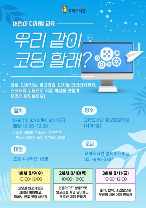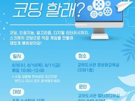 파주시 교하도서관은 여름방학을 맞아 8월 9일부터 11일까지, 디지털 문해력을 길러주는 ‘우리 같이 코딩 할래?’ 프로그램을 운영한다.