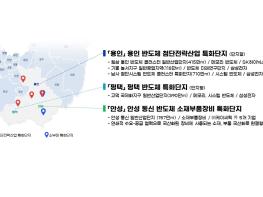 국가첨단전략산업 특화단지 반도체 분야에 지정된 곳은 용인 남사 첨단시스템 반도체클러스터(삼성전자) 용인 원삼 반도체클러스터(SK하이닉스) 용인 기흥 농서지구(삼성전자) 평택 고덕 국제화계획지구 일반산업단지(삼성전자) 4개 단지로 총면적 1,633에 이른다.