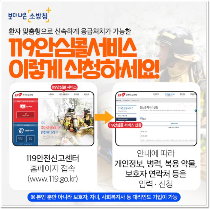 119안심콜 서비스는 장애가 있는 분, 고령자 및 독거노인 등에게 위급상황 발생 시 구급대원이 질병 및 특성을 미리 알고 신속하게 출동하여 맞춤형으로 응급처치와 병원 이송이 가능한 서비스다.