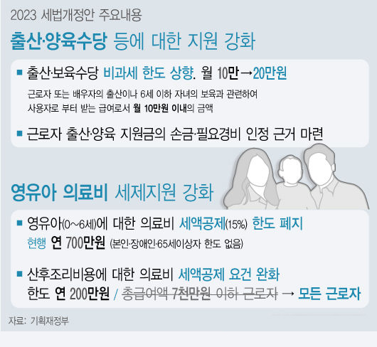 10년 넘게 묶인 출산·보육수당 비과세 한도가 월 10만원에서 20만원으로 확대 개편된다. 6세 이하 영유아에 대한 의료비도 한도 없이 전액 세액공제를 받게 된다.