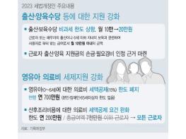 정부는 앞서 하반기 경제정책방향에서 발표한 대로 출산·보육수당 비과세 한도를 20만원으로 상향하기로 했다. 현행 10만원은 2003년 이후 유지돼 온 점과 최근 저출산이 심화하는 상황 등을 고려한 조치다.