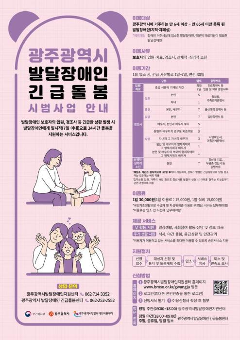 보호자는 긴급돌봄 서비스 이용 7일 전까지 광주시발달장애인지원센터 누리집 또는 유선전화로 예약하면 된다.