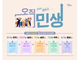 오직 민생 프로젝트로 명명된 민생경제 5대 정책은 물가는 지키고 일자리는 늘리고 지역경제에는 활력을 불어넣고 기업은 키우고 농가가 잘 사는 파주시를 만들겠다는 내용을 골자로 하고 있으며, 경제적 어려움이 지속되는 상황 속에서 소비자, 소상공인, 중소기업 등 시민이 체감하는 맞춤형 민생정책을 발굴·확대해 민생 안정과 소비 촉진, 지역경제 활성화를 이뤄나가겠다는 파주시의 2024년 민생정책이다.