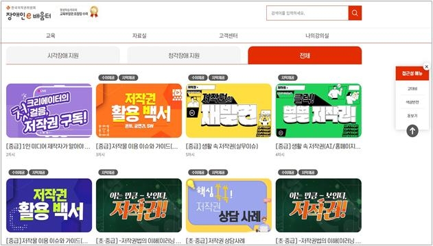 또한 이들을 위한 저작권 교육콘텐츠도 제공한다. 장애유형별로 각각 10개의 교육 과정을 통해 저작권의 기본 개념과 저작물 창작과 이용, 문화예술 활동과 관련한 주제별 과정 등을 소개한다.