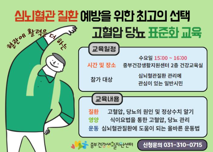 교육 관련 사항 문의는 중부건강생활지원센터 건강생활팀(031-310-0715, 0717)으로 하면 된다.