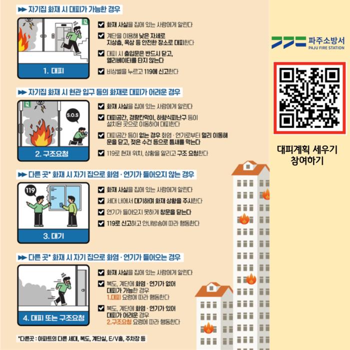 파주소방서(서장 이상태)는 7일 아파트 화재 시 인명피해 방지를 위해 대피요령 등을 쉽고 재미있게 익힐 수 있는 ‘우리 아파트 피난계획 세우기’ 캠페인을 2월 한달 간 전개한다고 밝혔다.