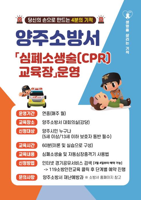 양주소방서(서장 강덕원)는 양주시민 대상으로 3월부터 12월까지 본서 3층 대강당에서 「상설 심폐소생술 교육장」을 운영한다고 밝혔다.