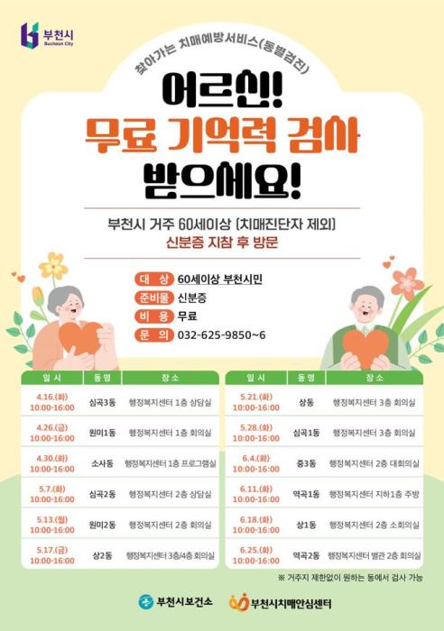 부천시(시장 조용익)는 시민의 치매예방 및 치매조기발견을 위해 상반기 ‘찾아가는 치매 조기검진(인지선별검사)’사업을 실시한다고 밝혔다.
