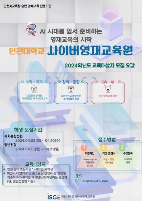 인천대 사이버영재교육원 관계자는 "디지털 전환 시대에 적합한 미래형 학습 기회를 제공하고 있다"며 "사전 평가 없이 영재교육을 받길 원하는 초등생은 누구나 신청할 수 있다"고 말했다.