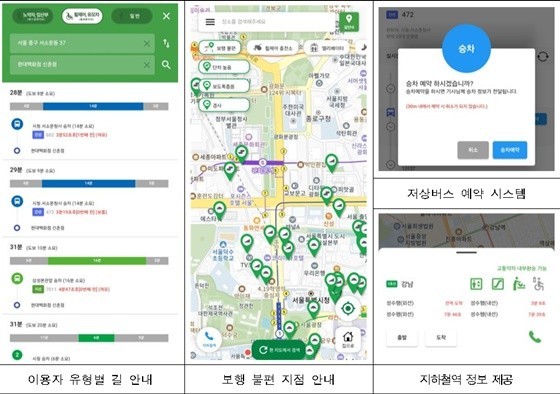 주요 기능은 ▲ 교통약자 맞춤형 길 안내와 보행 불편 지점 안내 ▲ 위치 기반 저상버스 예약 ▲ 지하철역 시설물 이용 정보 제공 ▲ 장애인 콜택시 앱 연계 등이다.