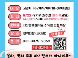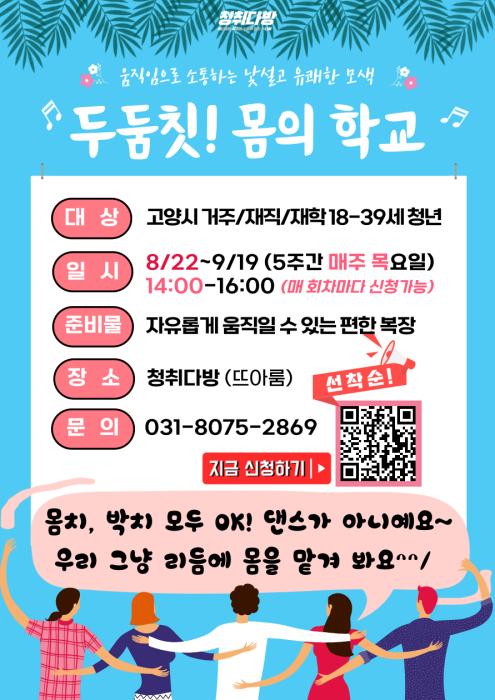 고양특례시(시장 이동환)는 오는 8월 22일부터 5주간 매주 목요일 오후 2시부터 4시까지 청년들의 심신을 치유해 주는 ‘두둠칫! 몸의 학교’프로그램을 운영한다고 밝혔다.