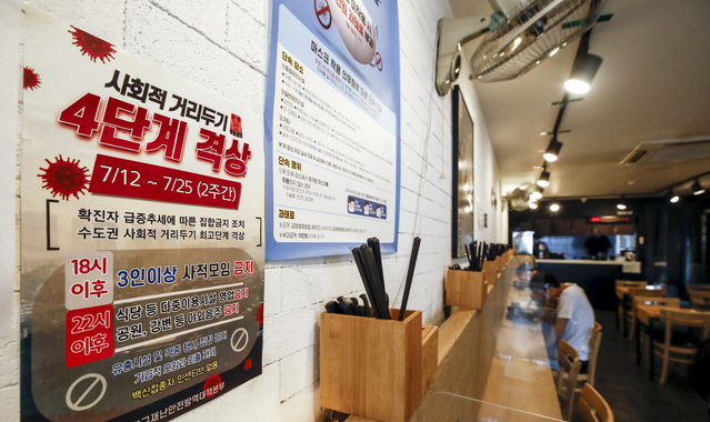 수도권에서 새로운 사회적 거리두기 4단계 시행에 따라 오후 6시 이후 사적 모임은 2인까지만 가능하지만, 동거 가족은 3명 이상 식사할 수 있다.
