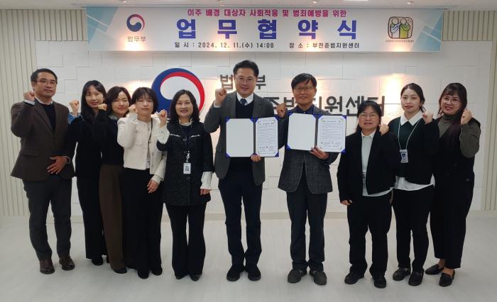 부천시 외국인주민지원센터(센터장 백선기)는 지난 11일 부천준법지원센터(소장 윤현봉)와 지역사회 이주배경 대상자의 안정적인 사회 적응과 준법의식 함양을 위해 상호협력체계 구축을 위한 업무협약을 체결했다.