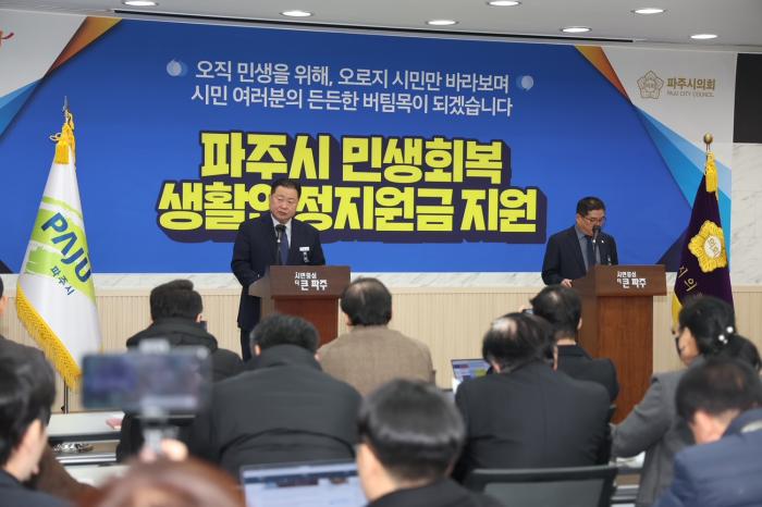 김경일 시장은 2일 오후 2시 시청 대회의실에서 긴급 기자회견을 열고 “최근 장기화된 경기침체와 지난해 말 터진 비상계엄 쇼크로 정국까지 불안해지면서 파주시민은 물론 대한민국 국민들의 삶이 점점 어려워지고 있다”라고 전제한 뒤 “어려움에 처한 지역 경제를 살리기 위해 지방정부가 해야 할 역할은 지역 내에서 돈이 돌게 해 위기 상황에 내몰린 소상공인을 살리고, 민생경제에 활력을 주는 일”이라며, 이번 민생회복 생활안정지원금 지급안을 2025년 제1호 공식문서로 결재하고 민생을 최우선 가치로 삼고 내수경기 활성화와 민생안정에 나설 것임을 밝혔다.