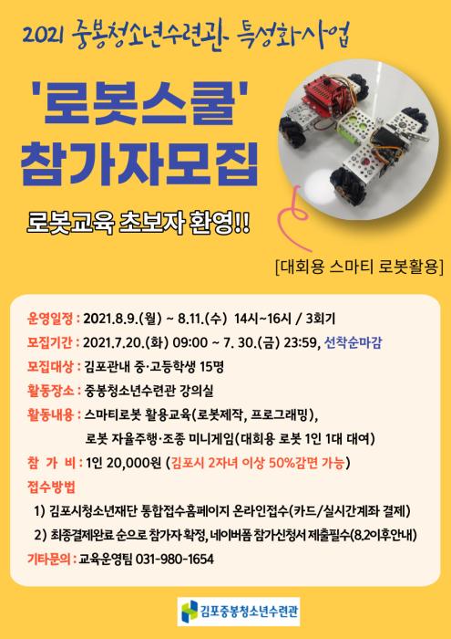 (재)김포시청소년재단 중봉청소년수련관은 여름방학을 맞이하여 신기술분야 미래혁신인재 양성을 위한 특성화사업 ‘로봇스쿨’ 참가자를 7.20.(화)부터 7.30(금)까지 선착순 모집한다.