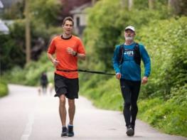 피터는 가이드러너와 함께 벤쿠버가상 마라톤 대회에 출전할 수 있었습니다. 19일 간의 마라톤이 끝나고 나서 가이드러너들과 완주의 기쁨을 서로 나눈다.