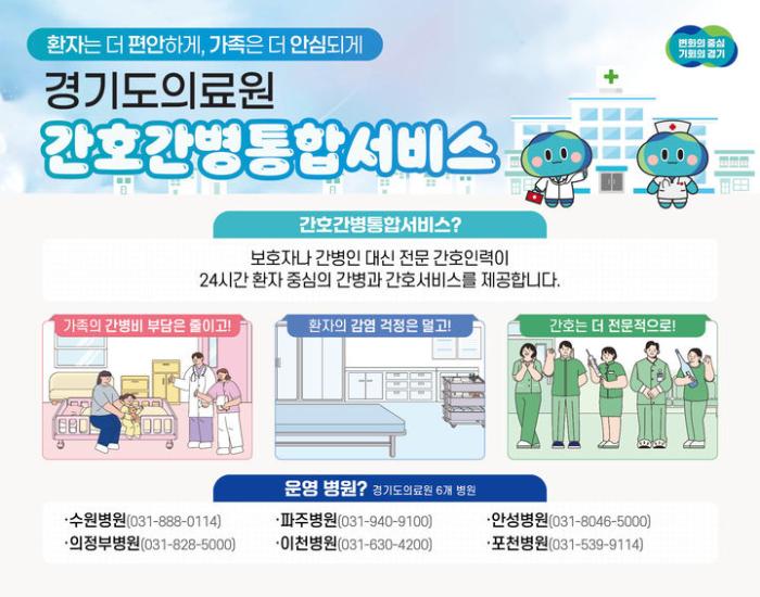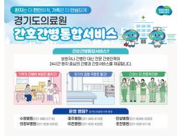15일 도에 따르면 간호간병통합서비스는 보호자나 간병인 대신 전문 간호사가 환자 중심 간병과 간호서비스를 제공한다. 2016년 9월부터 경기도의료원 6개 병원에서 시행 중이다.