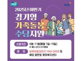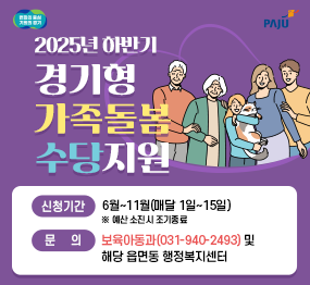 파주시가 내달 3일부터 생후 24~36개월 이하 아동을 돌보는 4촌 이내 친인척 또는 이웃 주민에게 월 30~60만 원을 지원하는 ‘하반기 경기형 가족돌봄수당’의 신청을 시작한다고 밝혔다.