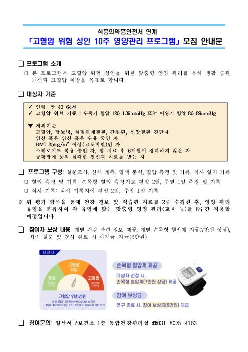 고양특례시(시장 이동환) 일산서구보건소는 ‘고혈압 위험 성인을 위한 맞춤 영양관리 프로그램’에 참여할 대상자를 7월 10일까지 모집한다고 밝혔다.
