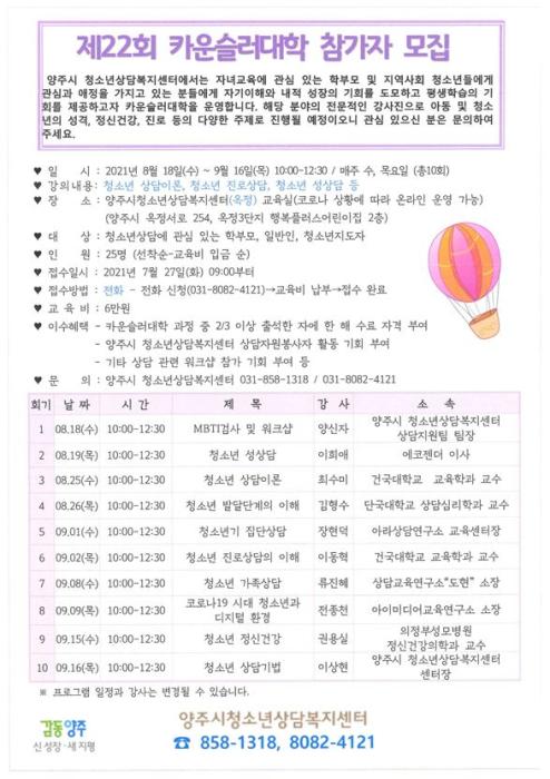 양주시청소년상담복지센터는 오는 8월 21일까지 제22회 카운슬러대학 참가자 25명을 선착순으로 모집한다,