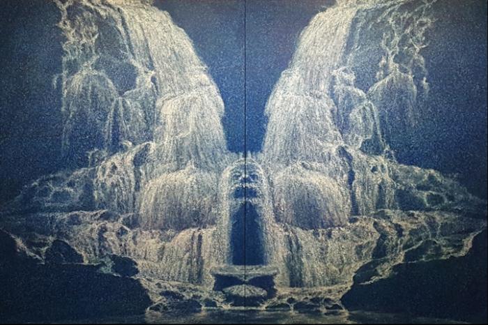 이 작품은 폭포수의 다양한 변신 중에서 스크린에 비친 산수화처럼 보이기도 한 모습으로 낙하수를 표현 하였고, 낙하 수 아래의 다른 존재들을 만나면서 벌어지는 현상을 표현 하였다. 물은 낙하 중에 만난 다른 존재들에 의해 사방팔방으로 흩어지면서 다음 행보로 이어 진다. 기체화 되어 상승하기도 하고, 다시 완곡한 포물선을 그으면서 폭포 아래의 용연에 합류한다. ‘용연’에 모인 물은 깊은 용연 바닥까지 휘 감고 들어가서 재정비하여 비로소 표면으로 올라와 다시 다른 세계로 생명에너지를 전해 주러 간다.