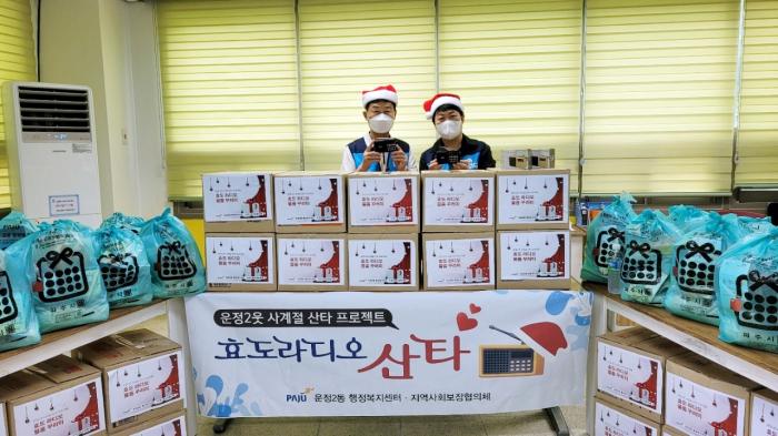이는 ‘운정이웃 사랑나눔, 연중 산타프로젝트’의 일환으로 추진하는 4번째 활동이다. 코로나19 장기화로 힘든 시기를 보내고 있는 운정2동 거주 독거어르신 70가구에 ‘효도라디오’와 마스크, 쿨스카프, 모기기피제 및 식료품 꾸러미 등을 전달했다.
