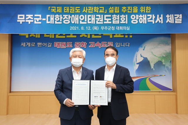 황인홍 무주군수와 윤웅철 대한장애인태권도협회 부회장은 12일 군청 대회의실에서 국제 태권도 사관학교 설립 및 글로벌 태권도 인재 발굴 육성 등의 과정에 상호 협력을 약속하는 업무협약을 체결했다.