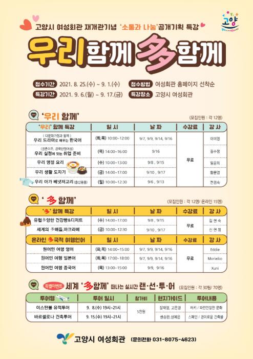 고양시(시장 이재준) 여성회관이 재개관을 기념해 ‘소통과 나눔’이라는 메시지를 담은 특별 공개강좌 「우리함께 多함께」를 오는 9월 6일부터 2주간 운영한다.