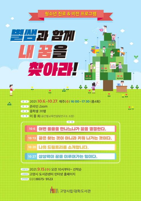 고양시(시장 이재준) 대화도서관이 공공도서관 진로독서 프로그램 「별쌤과 함께 내 꿈을 찾아라!」를 10월 6일부터 10월 27일까지 온라인으로 운영한다.