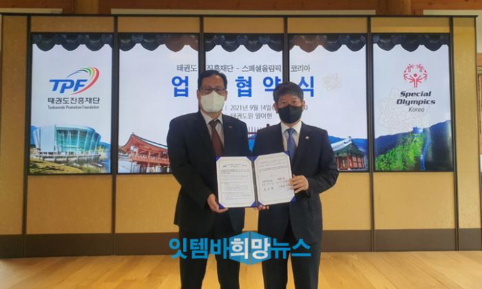 전북 무주 태권도진흥재단(이사장 오응환)은 스페셜올림픽코리아(회장 이용훈)와 발달장애인의 체육·문화활동을 상호 돕기로 약속한 업무협약(MOU)을 체결했다고 14일 밝혔다.앞으로 양 기관은 수련과 숙박, 취식 등의 공간을 갖춘 태권도원을 활용해 발달장애인 선수들의 전주훈련을 진행키로 했다. 태권도원에서 진행하는 태권도 시범공연 관람 등 체육·문화활동을 상호돕는다.또 상호 연계 가능한 프로그램을 공동개발·지원하고, 국기 태권도에 진흥·보급도 협력한다. 이용훈 회장은 "업무협약이 발달장애인의 생활체육 저변 확대와 태권도의 스페셜올림픽 세계대회 정식종목 채택을 위한 의미있는 첫 걸음이 될 것"이라며 "스페셜올림픽 선수를 위해 지원과 협력을 약속한 태권도진흥재단에 감사의 말씀을 드린다"고 말했다.오응환 이사장은 "11월 예정된 제15회 스페셜올림픽 전국하계대회부터 태권도 품새가 정식종목이 됐다"면서 "이를 위해 노력해 준 이용훈 회장과 사무국 그리고 발달 장애인 태권도 선수들께 감사한 마음을 전한다"고 밝혔다.이어 "태권도진흥재단은 장애인 태권도와 체육이 더욱 발전할 수 있도록 스페셜올림픽코리아와 협력을 이어가겠다"고 덧붙였다.한편, 스페셜올림픽은 발달장애인의 운동능력과 사회적응력을 높이기 위해 지난 1975년부터 4년마다 열리는 국제대회다. 국내에서는 스페셜올림픽코리아가 국가대표 선수단을 선발해 출전한다.