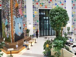 ‘플라워 북카페’ 1층에는 도서 열람 및 휴식 장소와 함께 다양한 볼거리가 자리잡고 있다. 9m 높이의 초대형 북트리 ‘원더랜드’ 작품이 내부에 자리잡고 있으며, 꽃과 거북, 동굴 등을 연상시키는 엄선된 수석작품 72점도 별도 코너에 전시된다.