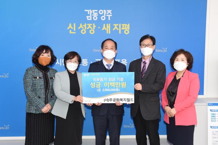 양주시(시장 이성호)는 지난 22일 (사)무궁화복지월드와 (주)KRC가 양주시청을 방문해 어려운 이웃을 위해 써달라며 이웃돕기 성금을 기부했다고 밝혔다.