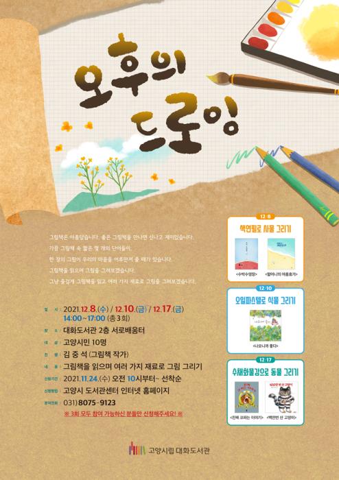 고양시(시장 이재준) 대화도서관이 독서문화프로그램 「오후의 드로잉」을 12월 8일, 10일, 17일 오프라인으로 운영한다.