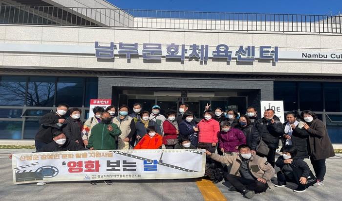 경남지체장애인협회 산청군지회는 산청군 장애인 문화활동 지원사업의 하나로 산청군 작은영화관에서 ‘영화 보는 날’을 운영했다고 26일 밝혔다.이번 문화 활동 지원사업은 산엔청복지관, 산청군장애인가족지원센터와 연계해 진행됐다. 3회에 걸쳐 53명의 장애인과 활동지원사·인솔자 등 총 80명이 참여했다.산청군지회는 참여자의 만족·호응도가 높아 내년부터는 매월 마지막 주 수요일을 ‘산청군 장애인 문화가 있는 날’로 지정해 산청군작은영화관에서 월1회 문화활동 지원사업을 시행할 예정이다.산청군지회 김의호 회장은 “장기화된 코로나19 여파로 장애인의 사회참여가 더욱 줄어들고, 신체적 제약으로 문화활동 참여에 어려움이 많아 안타까웠다”며 “우리지역의 문화시설을 활용해 앞으로도 지속적인 장애인 복지증진 사업에 힘쓰겠다”고 말했다.