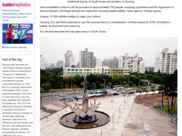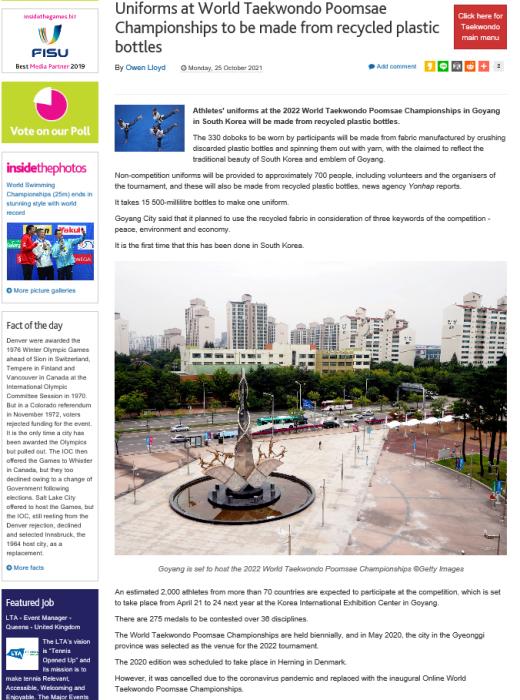 1. 세계적 스포츠 웹진 ‘Inside the Games’에 실린 2022 고양 세계태권도품새선수권대회 폐페트병 활용한 유니폼에 대한 기사. WT 등에 이 유니폼에 대한 문의가 쇄도했다.