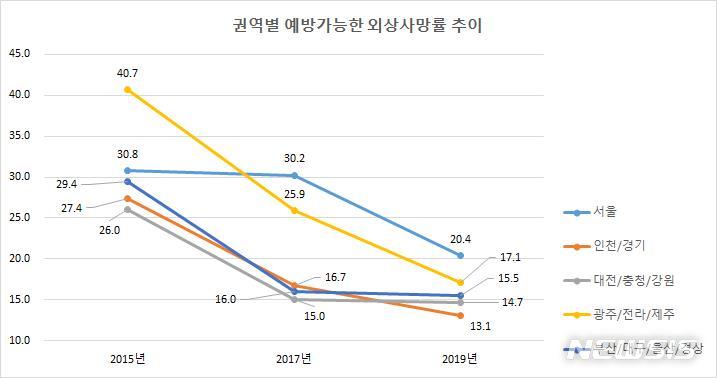 예방 가능한 외상 사망률은 ▲서울 ▲인천·경기 ▲대전·충청·강원 ▲광주·전라·제주 ▲부산·대구·울산·경상 등 5개 권역에서 모두 낮아졌다.