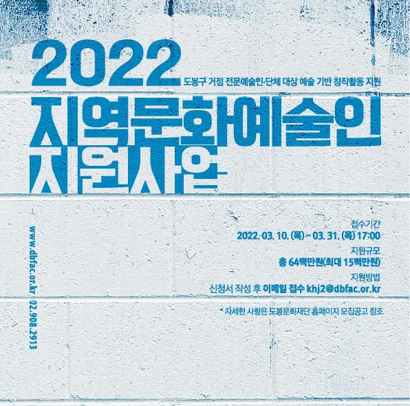 접수 기간은 오는 10일부터 31일까지이다. 도봉문화재단 홈페이지에서 지원서 양식을 다운받아 작성 후 이메일로 제출하면 된다. 공모에 관한 자세한 사항은 도봉문화재단 홈페이지에서 확인할 수 있다.