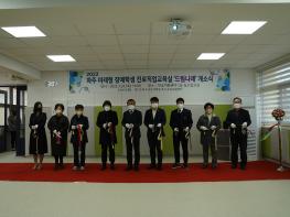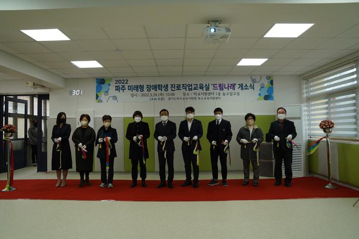 ◦ 첨단 에듀테크를 활용한 직업교육실 구축으로 장애학생의 미래 직업체험 기회 확대 ◦ 미래형 진로직업교육 및 체험기관의 지역별 편차 해소와 장애학생 맞춤형 진로직업교육 지원 파주교육교육지원청(교육장 정필영) 특수교육지원센터는 3월 24일(목) 파주 미래형 장애학생 진로직업교육실‘드림나래’개소식을 개최했다고 밝혔다. 이날 개소식에는 파주교육지원청 정필영 교육장, 경기도의회 조성환 의원, 경기도교육청 특수교육과 김선희 과장 등 20여 명이 참석했다. 미래형 장애학생 진로직업교육실 ‘드림나래’는 4억 9,650만원 예산으로 첨단 에듀테크를 활용한 직업교육실을 구축하여 진로 탐색 및 진로 설계의 참여가 제한적인 장애학생에게 미래 직업체험 기회를 확대하고, 장애 특성 및 수준별 진로직업교육을 제공하기 위한 목적으로 설립되었다. 미래형 진로직업교육실 ‘드림나래’는 5개실로 ▲Cafe 별하, ▲미래교육실, ▲미디어교육실, ▲직업평가실, ▲놀고잡고실 등 특수교육대상학생에 대한 미래형 진로직업교육 및 문화 체험을 위한 공간으로 구성되었으며, 약 8,500만원의 예산으로 1인미디어, VR모의면접, 컴퓨터ITQ자격증반, 발달행정보조사자격증반 등의 다양한 프로그램을 추진할 예정이다. 파주교육지원청 정필영 교육장은“미래형 진로직업교육실 드림나래는 파주 관내 장애학생들의 직업교육 거점센터로 역할을 하며 진로직업교육 및 체험기관의 지역별 편차를 해소할 수 있을 것으로 기대된다.”라고 전했다. |